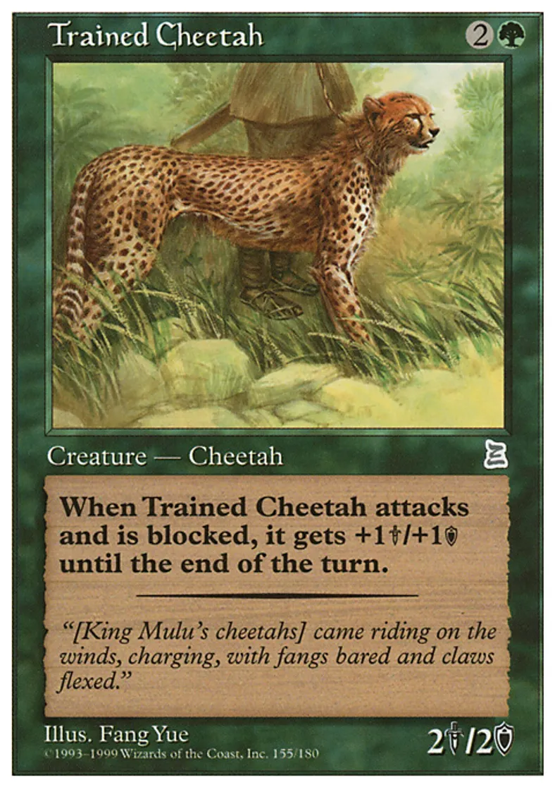 | Oracle Text | Whenever Trained Cheetah becomes blocked, it gets +1/+1 until end of turn. | ||