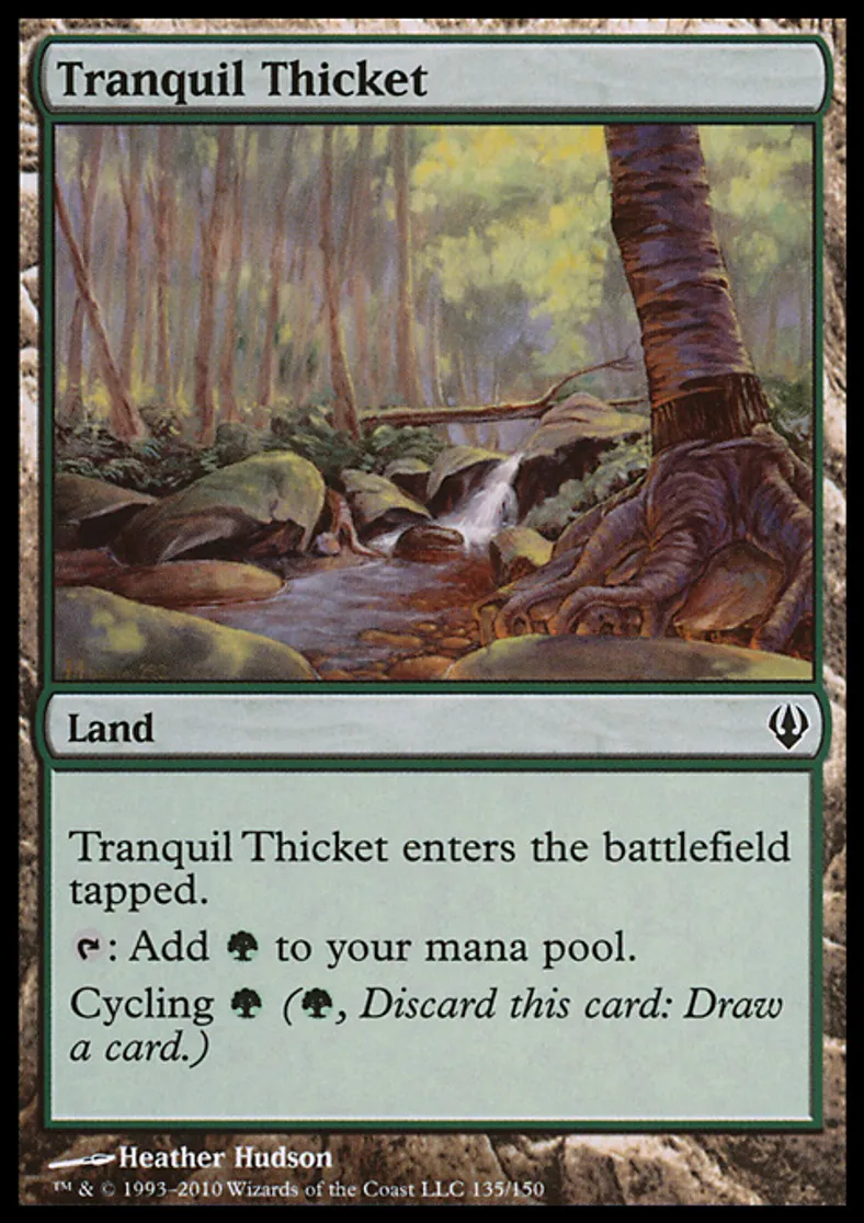 | Oracle Text | Tranquil Thicket enters the battlefield tapped. {{t}}: Add {{g}} to your mana pool. Cycling {{g}} ({{g}}, Discard this card: Draw a card.) | ||