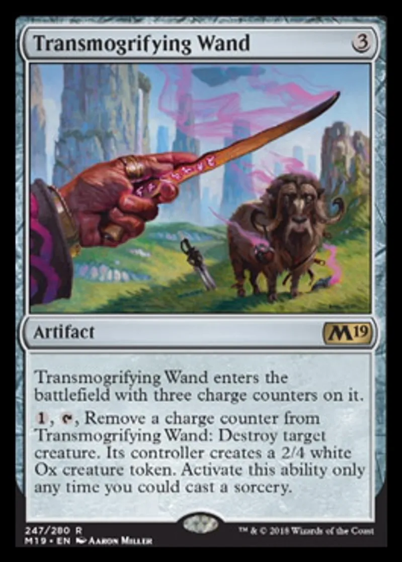| Oracle Text | Transmogrifying Wand enters the battlefield with three charge counters on it. {{1}}, {{t}}, Remove a charge counter from Transmogrifying Wand: Destroy target creature. Its controller creates a 2/4 white Ox creature token. Activate this ability only any time you could cast a sorcery. | ||