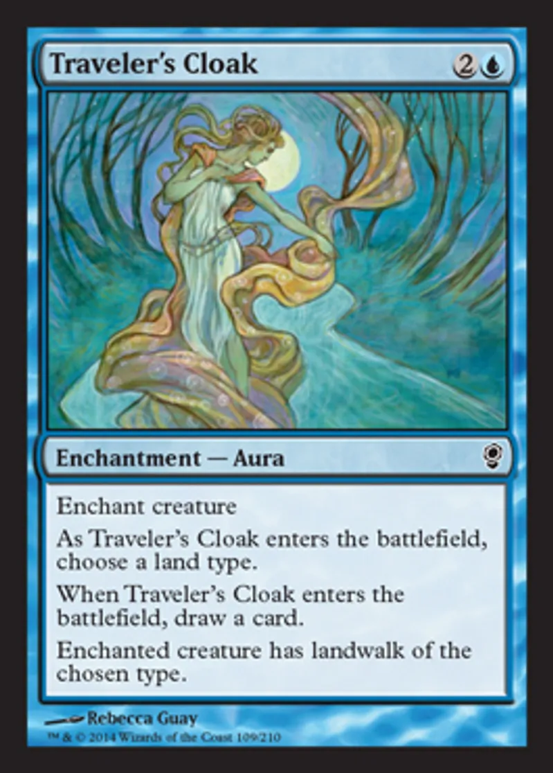 | Oracle Text | Enchant creature As Traveler's Cloak enters the battlefield, choose a land type. When Traveler's Cloak enters the battlefield, draw a card. Enchanted creature has landwalk of the chosen type. | ||