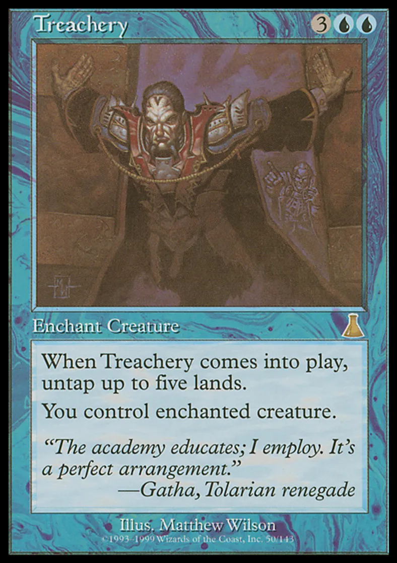 | Oracle Text | Enchant creature When Treachery enters the battlefield, untap up to five lands. You control enchanted creature. | ||
