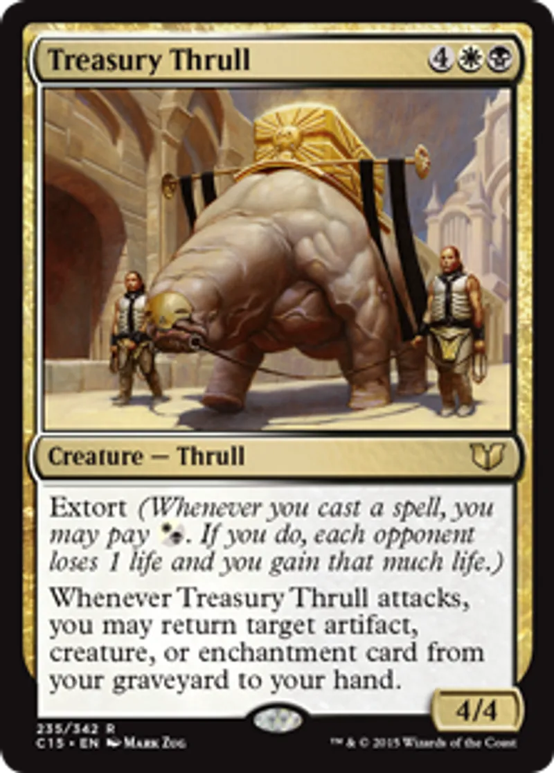 | Oracle Text | Extort (Whenever you cast a spell, you may pay {{wb}}. If you do, each opponent loses 1 life and you gain that much life.) Whenever Treasury Thrull attacks, you may return target artifact, creature, or enchantment card from your graveyard to your hand. | ||