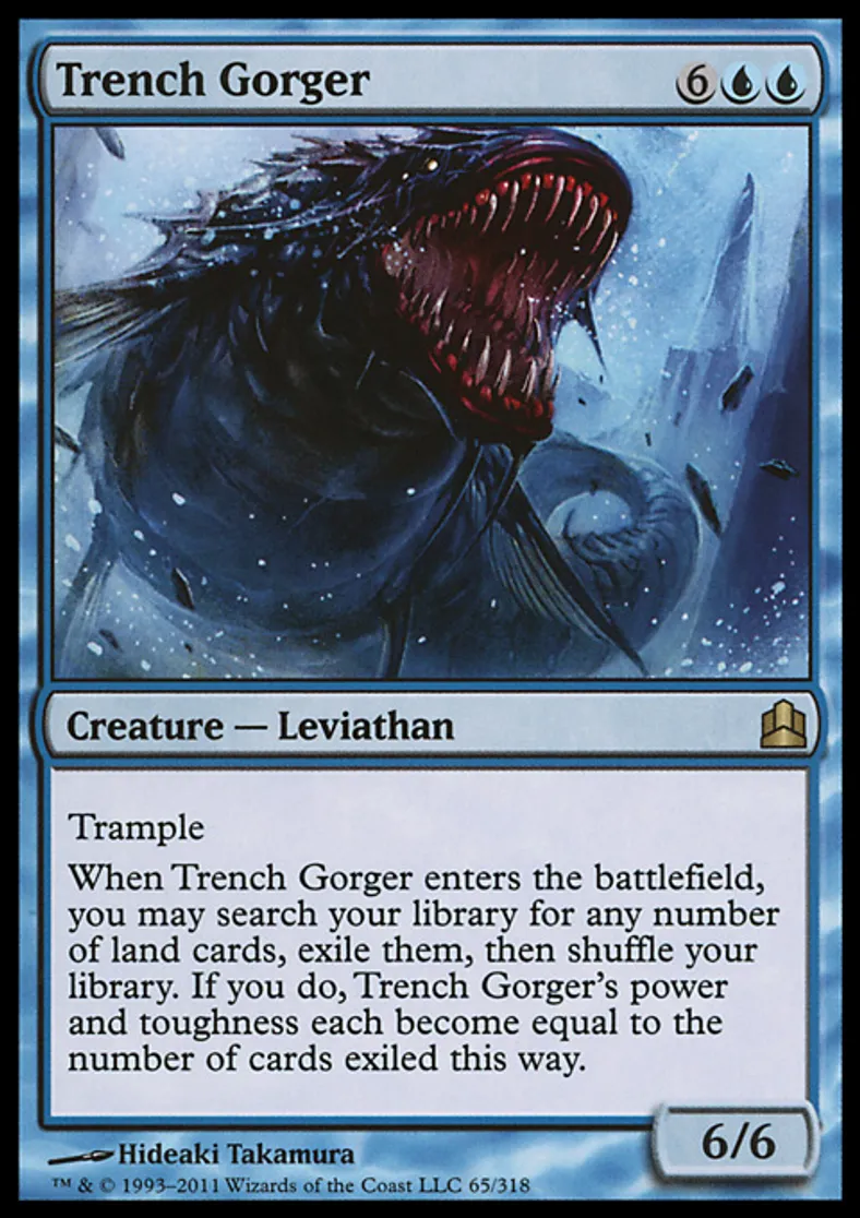 | Oracle Text | Trample When Trench Gorger enters the battlefield, you may search your library for any number of land cards, exile them, then shuffle your library. If you do, Trench Gorger's power and toughness each become equal to the number of cards exiled this way. | ||