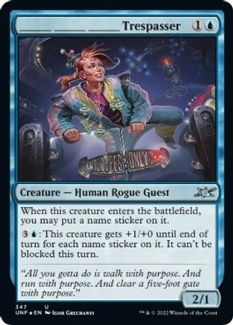 Magic: the Gathering (mtg) Uncommon Creature — Human Rogue Guest _____ _____ _____ Trespasser from Unfinity (UNF) last updated 2026-02-21 16:13:32