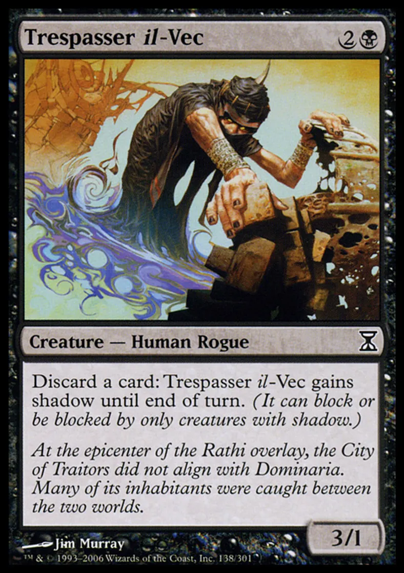 | Oracle Text | Discard a card: Trespasser il-Vec gains shadow until end of turn. (It can block or be blocked by only creatures with shadow.) | ||