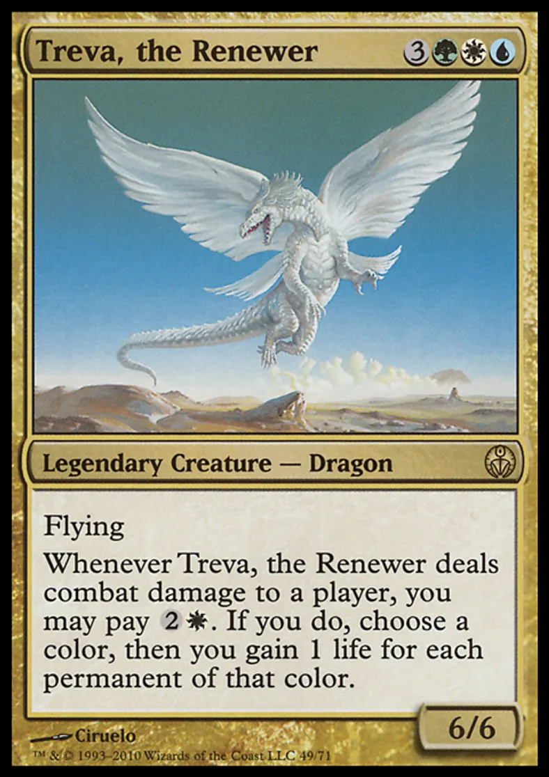 | Oracle Text | Flying Whenever Treva, the Renewer deals combat damage to a player, you may pay {{2}}{{w}}. If you do, choose a color, then you gain 1 life for each permanent of that color. | ||