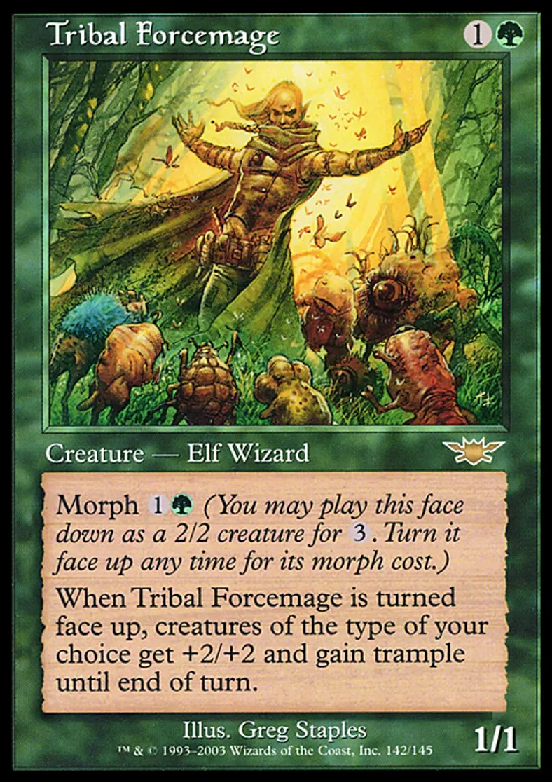 | Oracle Text | Morph {{1}}{{g}} (You may cast this face down as a 2/2 creature for {{3}}. Turn it face up any time for its morph cost.) When Tribal Forcemage is turned face up, creatures of the creature type of your choice get +2/+2 and gain trample until end of turn. | ||
