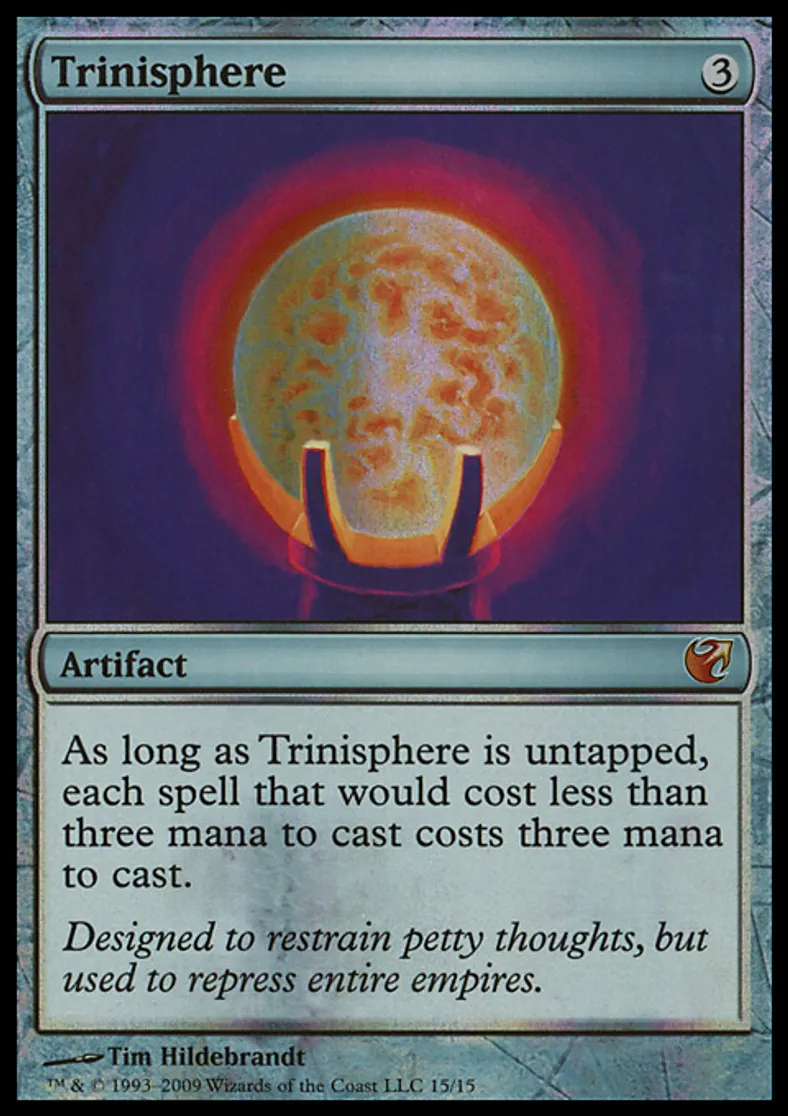 | Oracle Text | As long as Trinisphere is untapped, each spell that would cost less than three mana to cast costs three mana to cast. (Additional mana in the cost may be paid with any color of mana or colorless mana. For example, a spell that would cost {{1}}{{b}} to cast costs {{2}}{{b}} to cast instead.) | ||