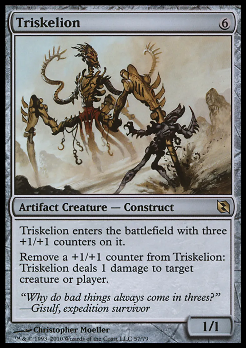 | Oracle Text | Triskelion enters the battlefield with three +1/+1 counters on it. Remove a +1/+1 counter from Triskelion: Triskelion deals 1 damage to target creature or player. | ||
