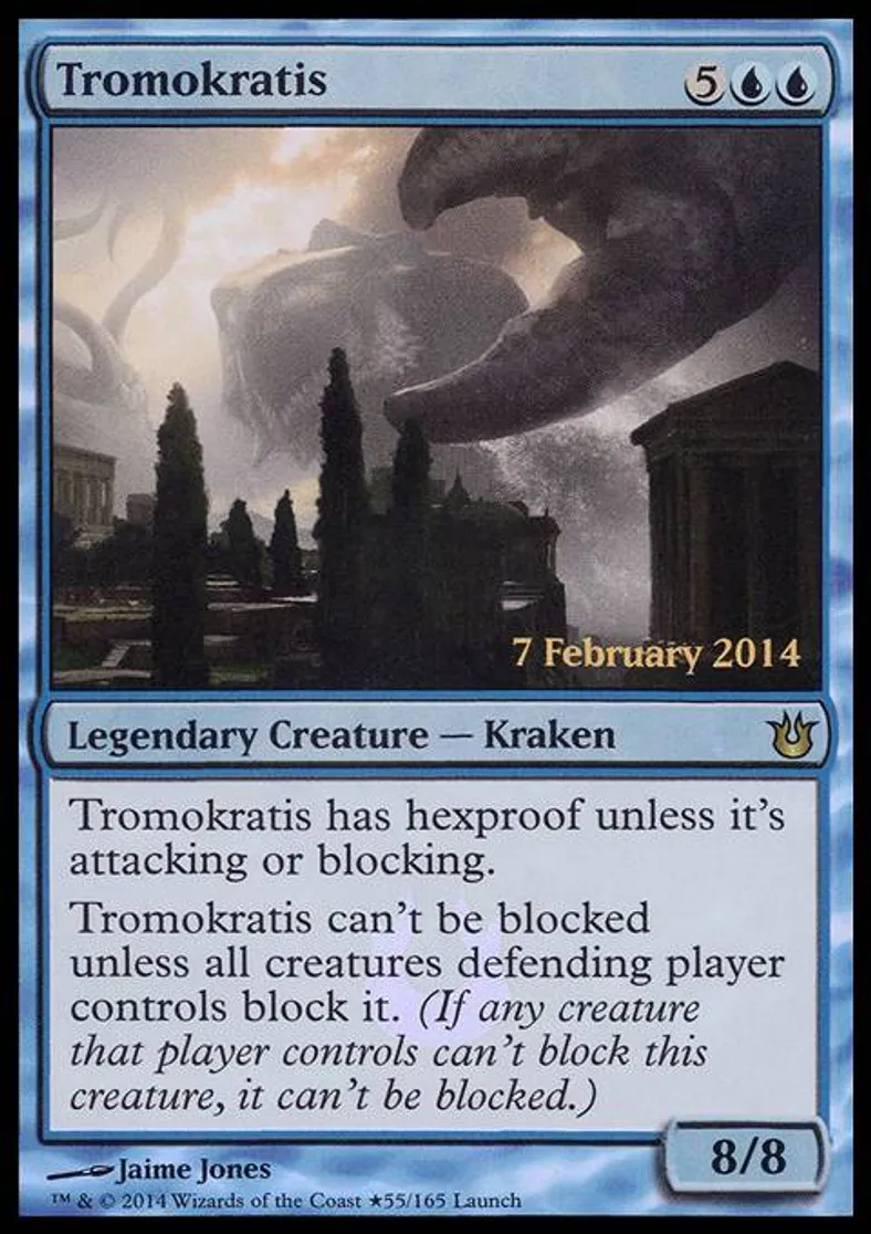 Tromokratis can't be blocked unless all creatures defending player controls block it. (If any creature that player controls doesn't block this creature, it can't be blocked.) | ||