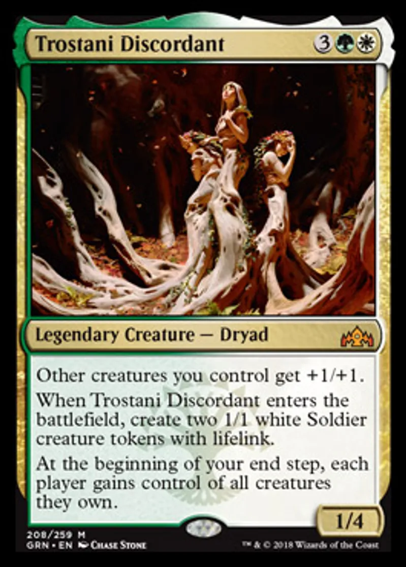| Oracle Text | Other creatures you control get +1/+1. When Trostani Discordant enters the battlefield, create two 1/1 white Soldier creature tokens with lifelink. At the beginning of your end step, each player gains control of all creatures they own. | ||
