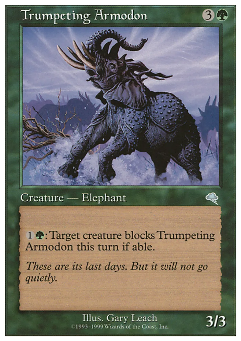 | Oracle Text | {{1}}{{g}}: Target creature blocks Trumpeting Armodon this turn if able. | ||
