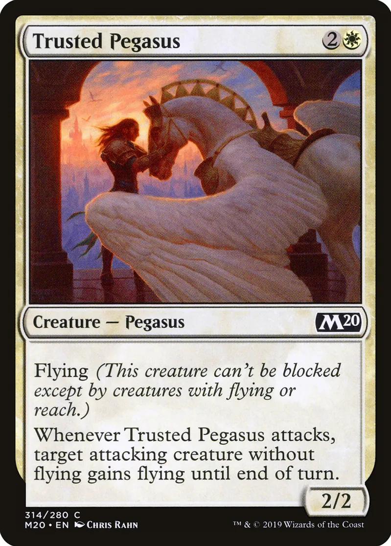 | Oracle Text | Flying (This creature can\'t be blocked except by creatures with flying or reach.)\r\nWhenever Trusted Pegasus attacks, target attacking creature without flying gains flying until end of turn. | ||