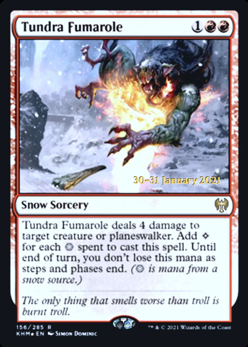 | Oracle Text | Tundra Fumarole deals 4 damage to target creature or planeswalker. Add {{c}} for each {{s}} spent to cast this spell. Until end of turn, you don't lose this mana as steps and phases end. ({{s}} is mana from a snow source.) | ||