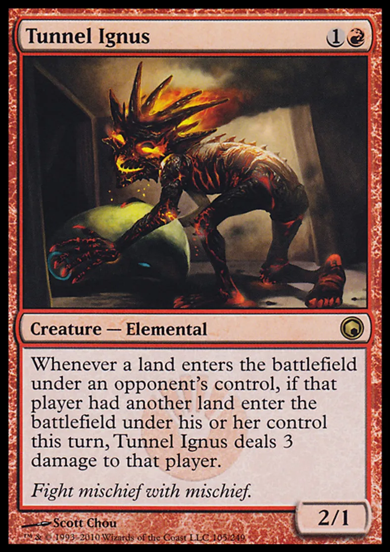 | Oracle Text | Whenever a land enters the battlefield under an opponent's control, if that player had another land enter the battlefield under his or her control this turn, Tunnel Ignus deals 3 damage to that player. | ||