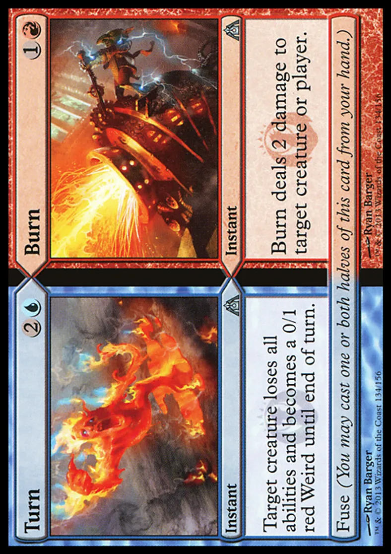 | Oracle Text | Burn deals 2 damage to target creature or player. Fuse (You may cast one or both halves of this card from your hand.) | ||