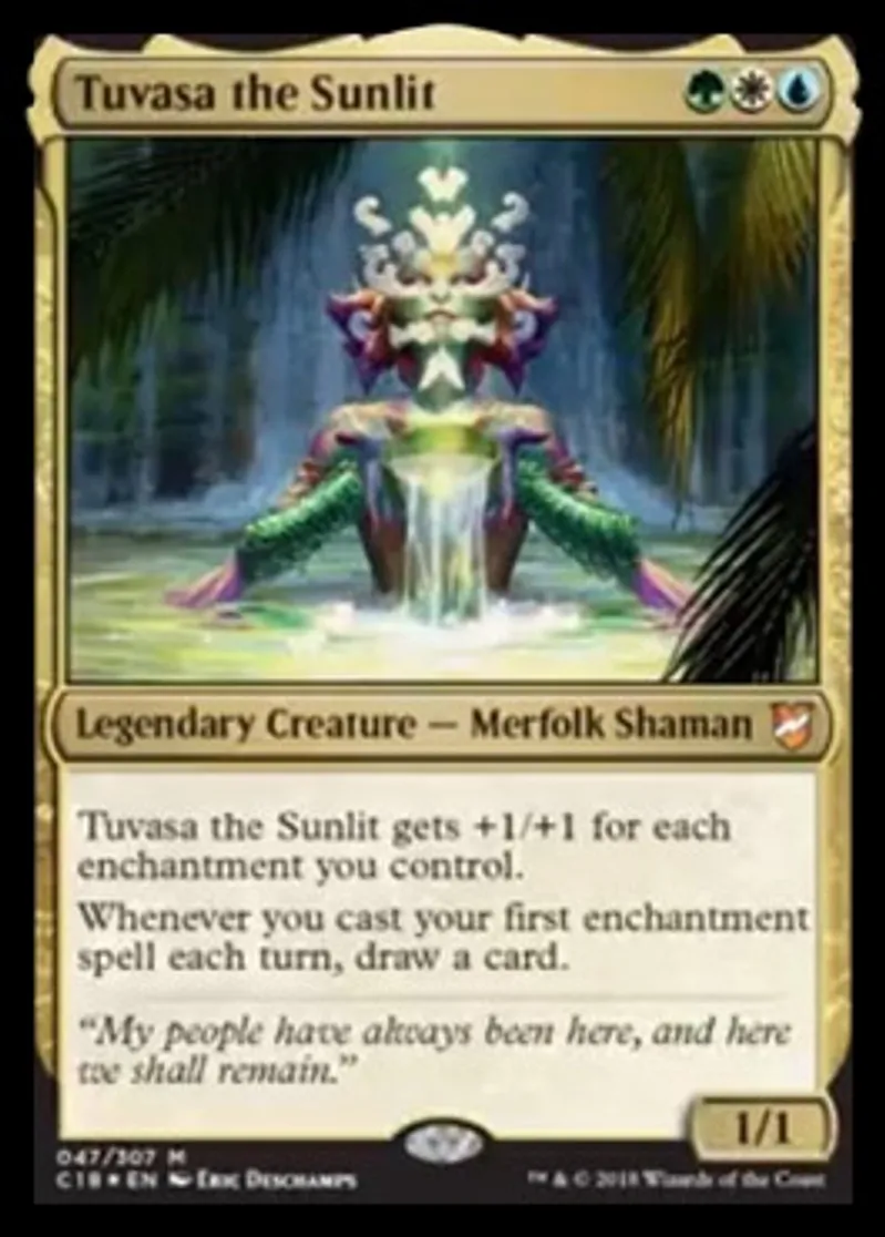 | Oracle Text | Tuvasa the Sunlit gets +1/+1 for each enchantment you control. Whenever you cast your first enchantment spell each turn, draw a card. | ||
