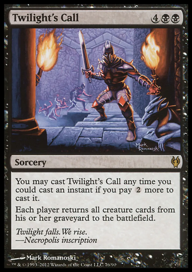 | Oracle Text | You may cast Twilight's Call any time you could cast an instant if you pay {{2}} more to cast it. Each player returns all creature cards from his or her graveyard to the battlefield. | ||