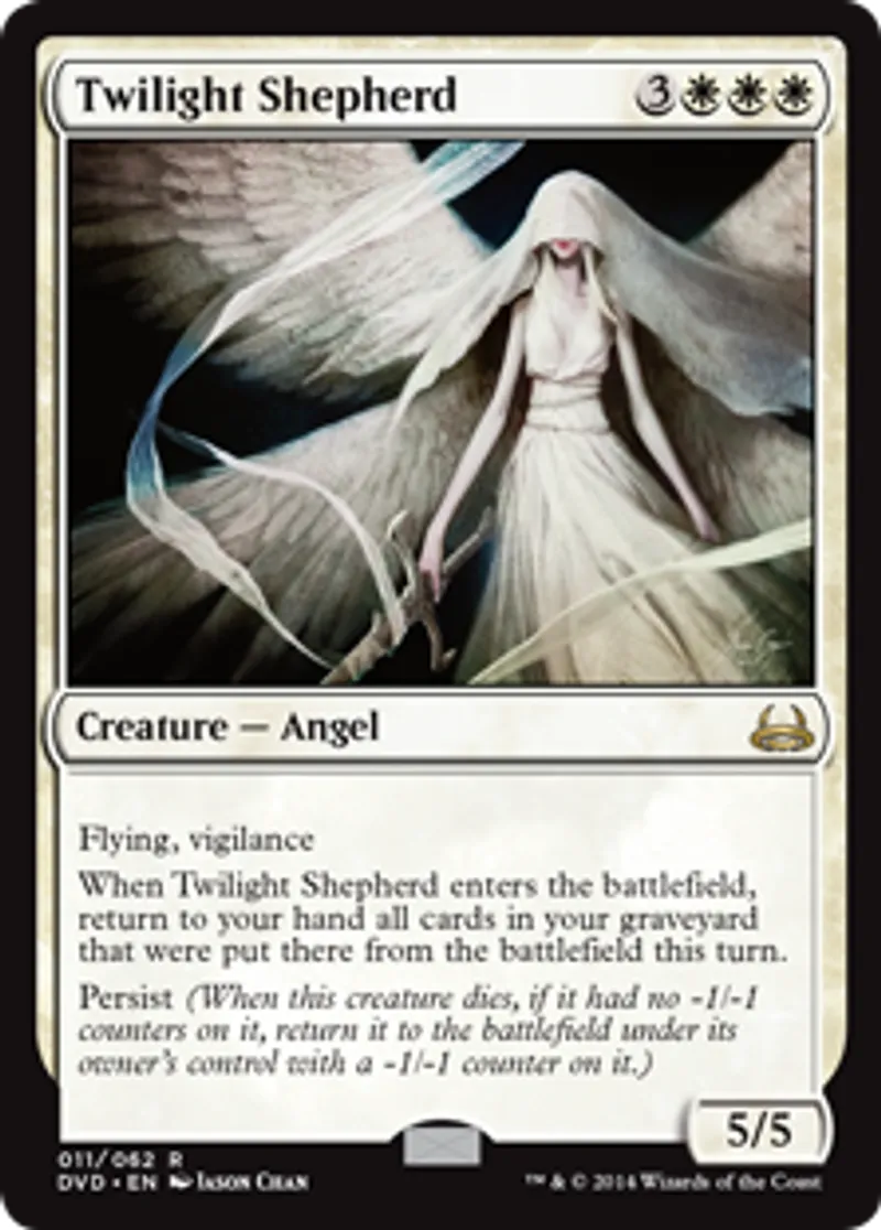 | Oracle Text | Flying, vigilance When Twilight Shepherd enters the battlefield, return to your hand all cards in your graveyard that were put there from the battlefield this turn. Persist (When this creature dies, if it had no -1/-1 counters on it, return it to the battlefield under its owner's control with a -1/-1 counter on it.) | ||