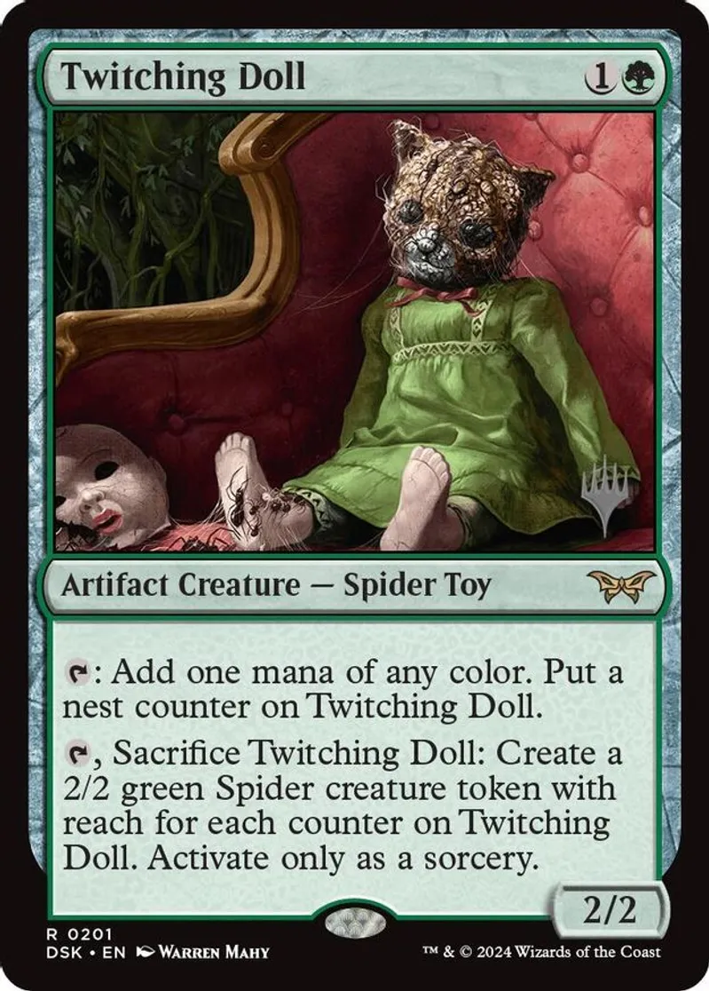| Oracle Text | t: add one mana of any color. put a nest counter on twitching doll. t, sacrifice twitching doll: create a 2/2 green spider creature token with reach for each counter on twitching doll. activate only as a sorcery. | ||