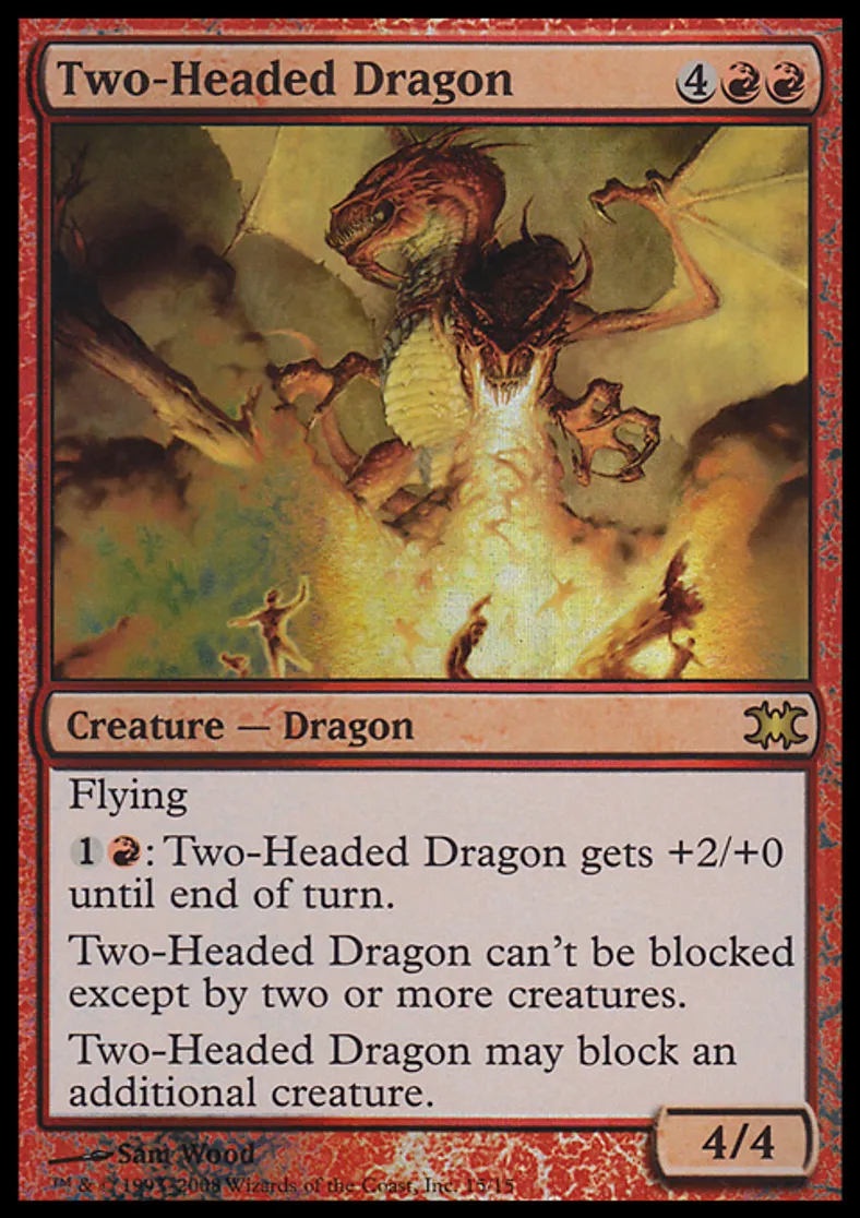 | Oracle Text | Flying {{1}}{{r}}: Two-Headed Dragon gets +2/+0 until end of turn. Two-Headed Dragon can't be blocked except by two or more creatures. Two-Headed Dragon can block an additional creature. | ||