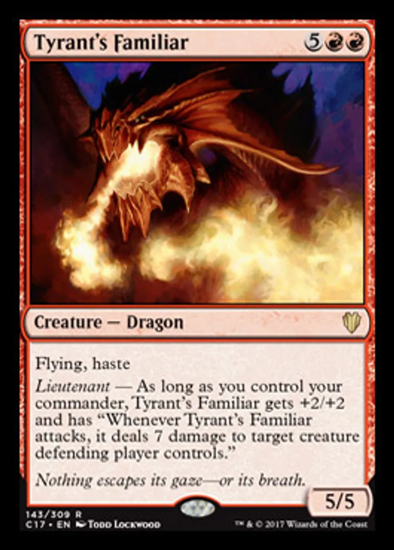 | Oracle Text | Flying, haste Lieutenant — As long as you control your commander, Tyrant's Familiar gets +2/+2 and has "Whenever Tyrant's Familiar attacks, it deals 7 damage to target creature defending player controls." | ||