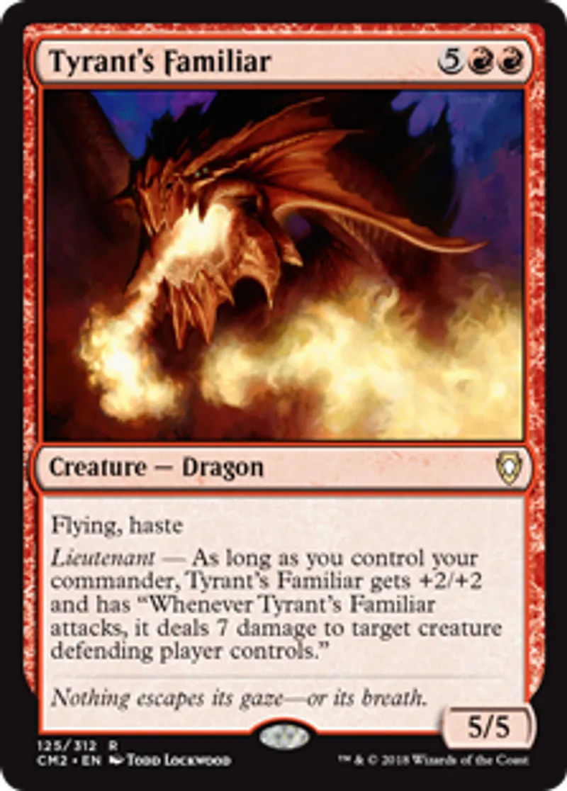 | Oracle Text | Flying, haste Lieutenant — As long as you control your commander, Tyrant's Familiar gets +2/+2 and has "Whenever Tyrant's Familiar attacks, it deals 7 damage to target creature defending player controls." | ||