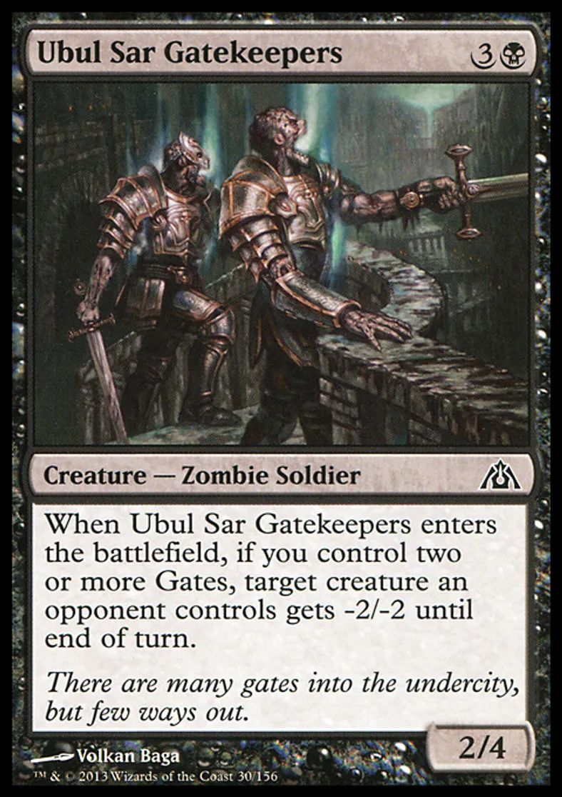 | Oracle Text | When Ubul Sar Gatekeepers enters the battlefield, if you control two or more Gates, target creature an opponent controls gets -2/-2 until end of turn. | ||