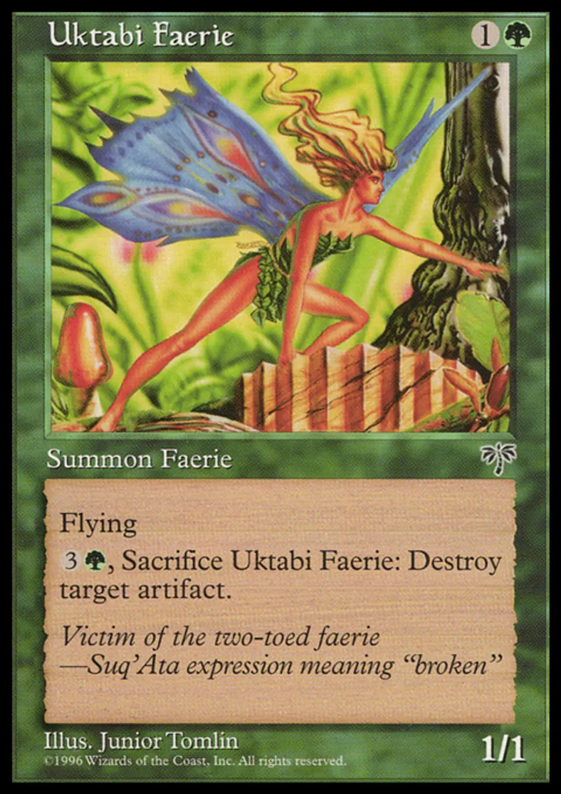 | Oracle Text | Flying {{3}}{{g}}, Sacrifice Uktabi Faerie: Destroy target artifact. | ||