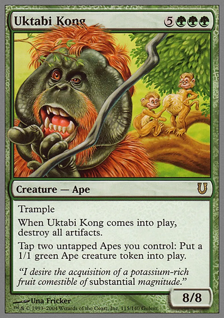 | Oracle Text | Trample When Uktabi Kong comes into play, destroy all artifacts. Tap two untapped Apes you control: Put a 1/1 green Ape creature token into play. | ||