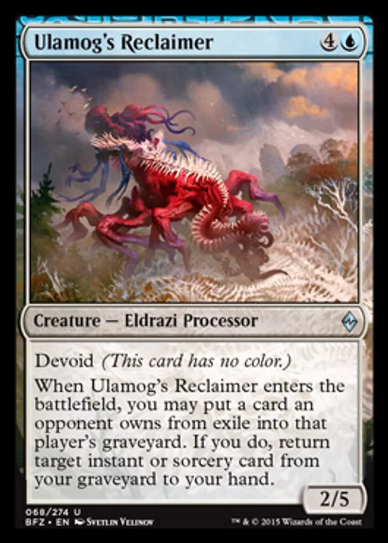 | Oracle Text | Devoid (This card has no color.) When Ulamog's Reclaimer enters the battlefield, you may put a card an opponent owns from exile into that player's graveyard. If you do, return target instant or sorcery card from your graveyard to your hand. | ||