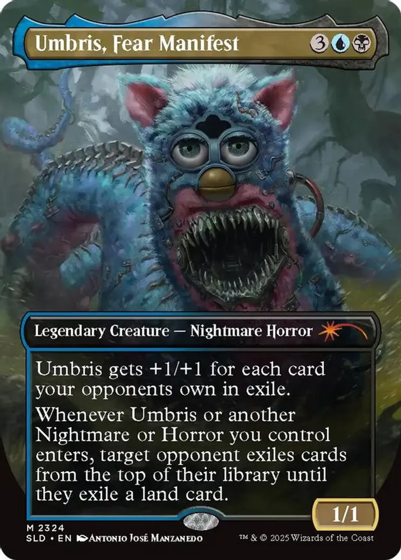 | Oracle Text | secret lair x furby: the oddbodies umbris gets +1/+1 for each card your opponents own in exile. whenever umbris or another nightmare or horror enters the battlefield under your control, target opponent exiles cards from the top of their library until they exile a land card. when purchasing this unique product, please keep in mind that this card only appears in secret lair x furby: the oddbodies and will ship out to you after the seller receives the product directly from wizards of the coast.the estimated time frame for sellers to receive stock is not fixed, so it could be anywhere between 1 - 10 weeks for delivery. | ||