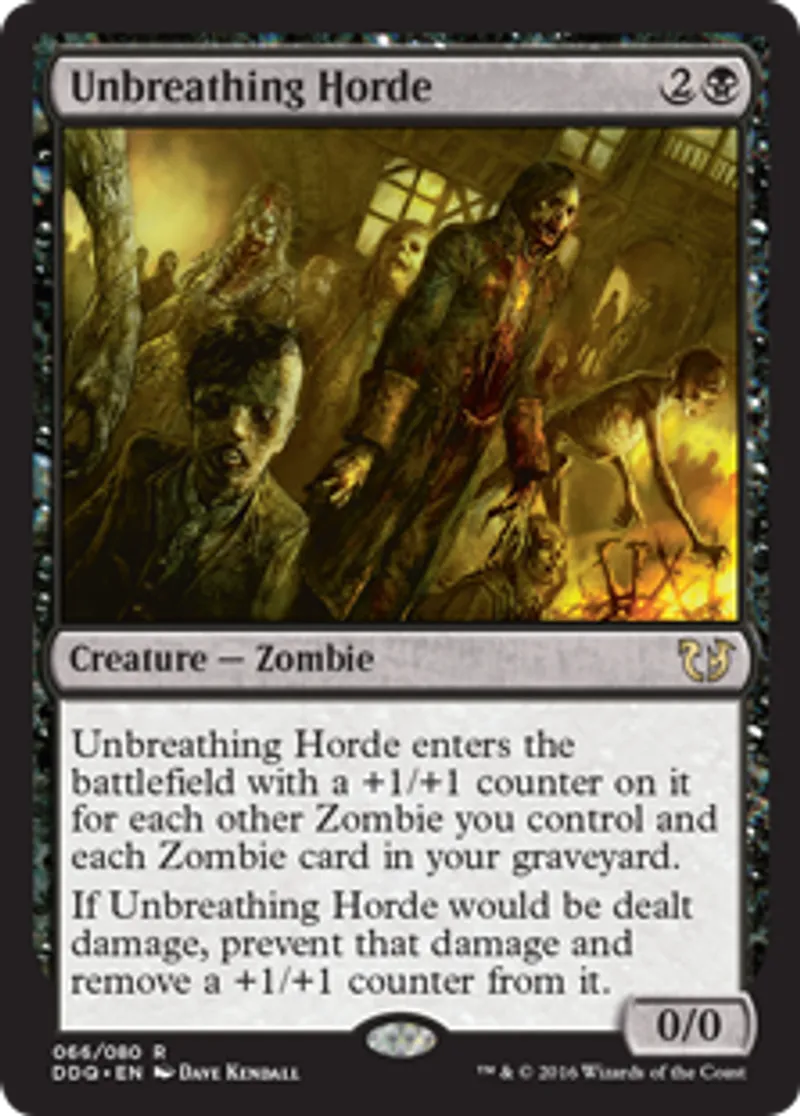 | Oracle Text | Unbreathing Horde enters the battlefield with a +1/+1 counter on it for each other Zombie you control and each Zombie card in your graveyard. If Unbreathing Horde would be dealt damage, prevent that damage and remove a +1/+1 counter from it. | ||
