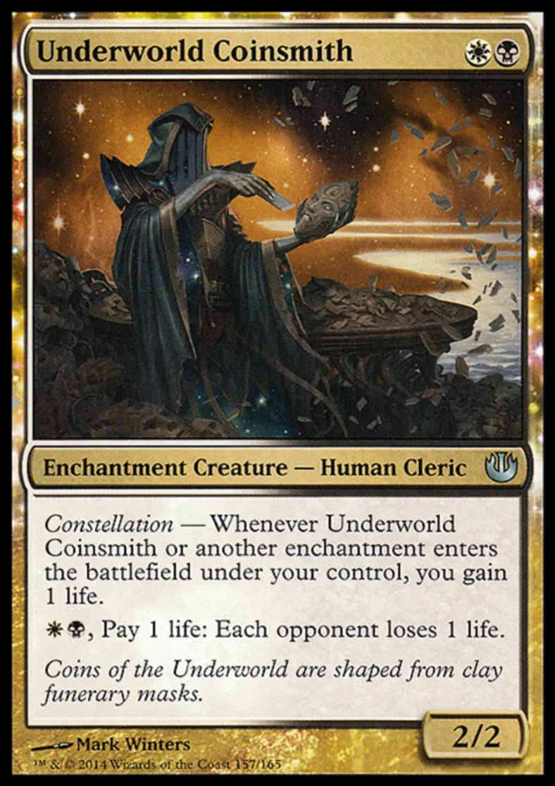 | Oracle Text | Constellation — Whenever Underworld Coinsmith or another enchantment enters the battlefield under your control, you gain 1 life. {{w}}{{b}}, Pay 1 life: Each opponent loses 1 life. | ||