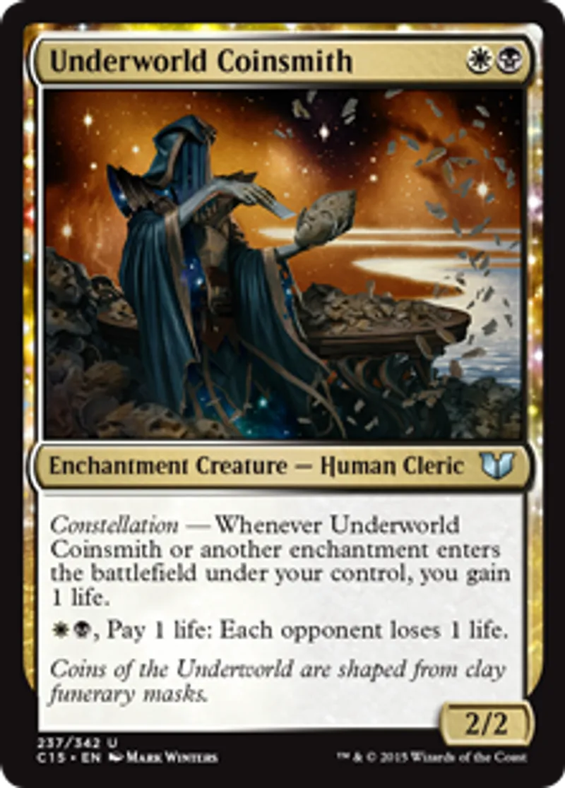 | Oracle Text | Constellation — Whenever Underworld Coinsmith or another enchantment enters the battlefield under your control, you gain 1 life. {{w}}{{b}}, Pay 1 life: Each opponent loses 1 life. | ||