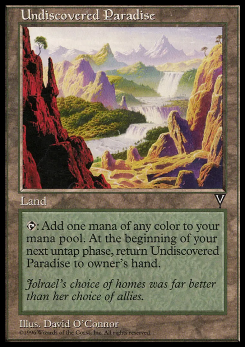| Oracle Text | {{t}}: Add one mana of any color to your mana pool. During your next untap step, as you untap your permanents, return Undiscovered Paradise to its owner's hand. | ||