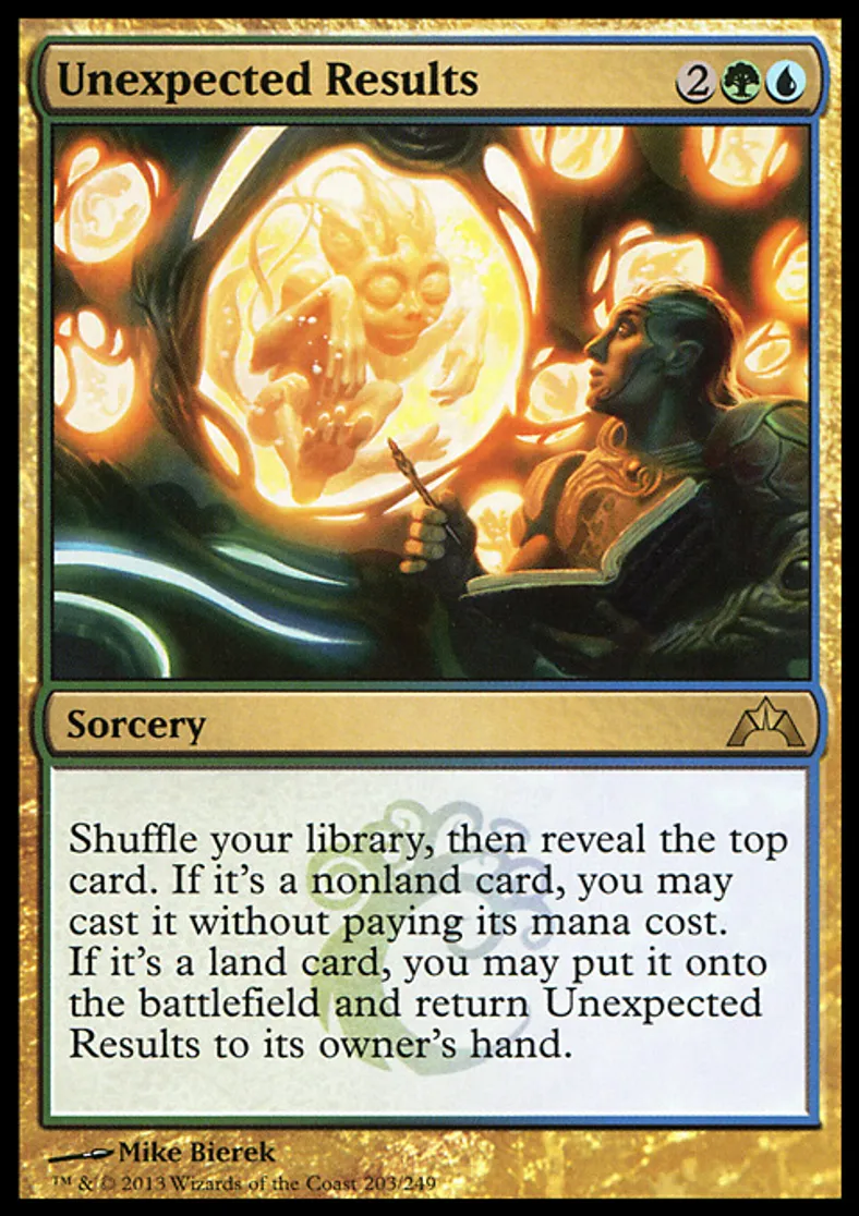 | Oracle Text | Shuffle your library, then reveal the top card. If it's a nonland card, you may cast it without paying its mana cost. If it's a land card, you may put it onto the battlefield and return Unexpected Results to its owner's hand. | ||