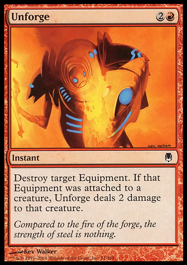 | Oracle Text | Destroy target Equipment. If that Equipment was attached to a creature, Unforge deals 2 damage to that creature. | ||