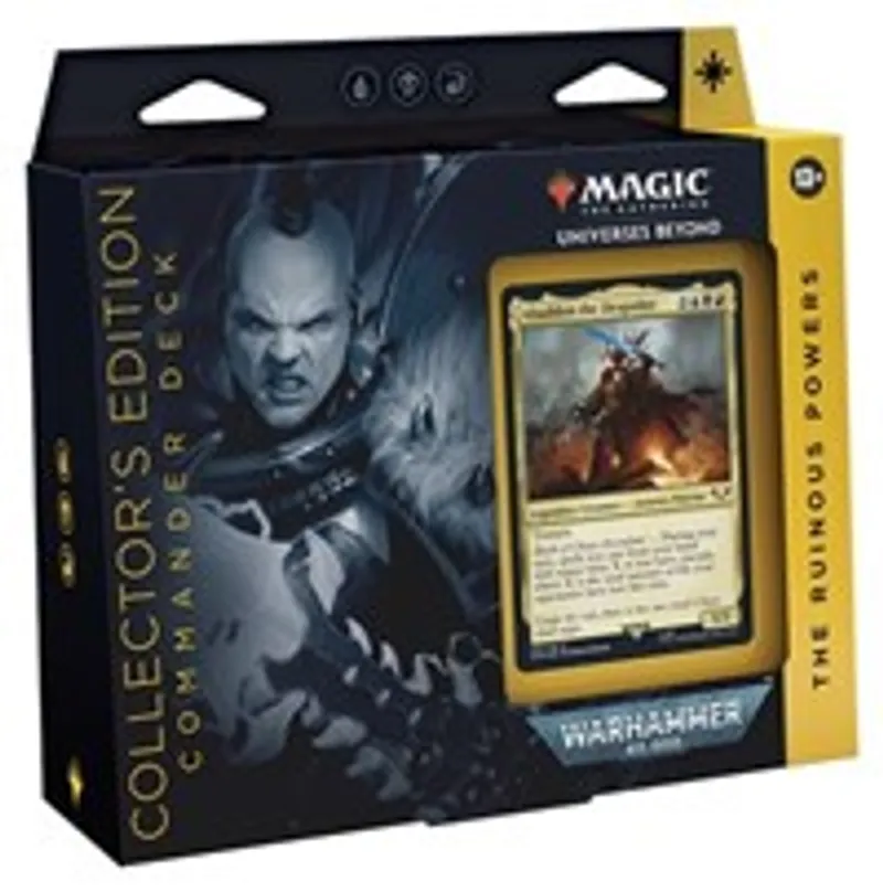 | Flavor Text | • Collector’s Edition Warhammer 40,000 Chaos Commander Deck—The Ruinous Powers (Blue-Black-Red) <br>• 100-card Surge Foil deck—including 2 Surge Foil commanders <br>• Every card features Warhammer-themed art—including 42 cards that are new to Magic <br>• 1 Surge Foil Display Commander, 10 double-sided Surge Foil tokens, 1 life tracker, and 1 deck box <br>• First release to include Surge Foil cards <br>• Command a new battlefield with epic multiplayer Magic games set in the world of the popular tabletop miniatures game, Warhammer 40,000 <br><br> The Collector’s Edition Ruinous Powers Warhammer 40,000 Commander Deck set includes 1 ready-to-play Blue-Black-Red deck of 100 Surge Foil Magic: The Gathering cards, 1 Surge Foil Display Commander, 10 double-sided Surge Foil tokens, 1 deck box (can hold 100 sleeved cards), 1 life tracker, 1 strategy insert, and 1 reference card. | ||