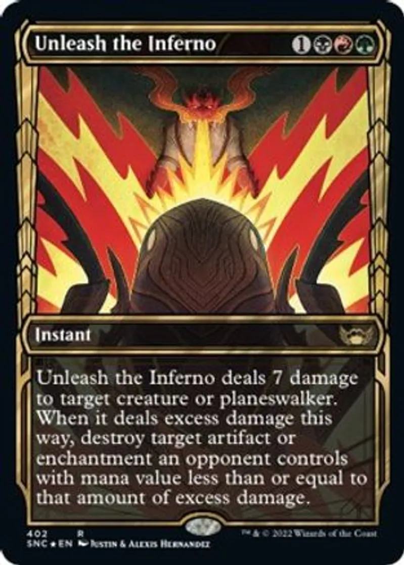| Oracle Text | Unleash the Inferno deals 7 damage to target creature or planeswalker. When it deals excess damage this way, destroy target artifact or enchantment an opponent controls with mana value less than or equal to that amount of excess damage. | ||