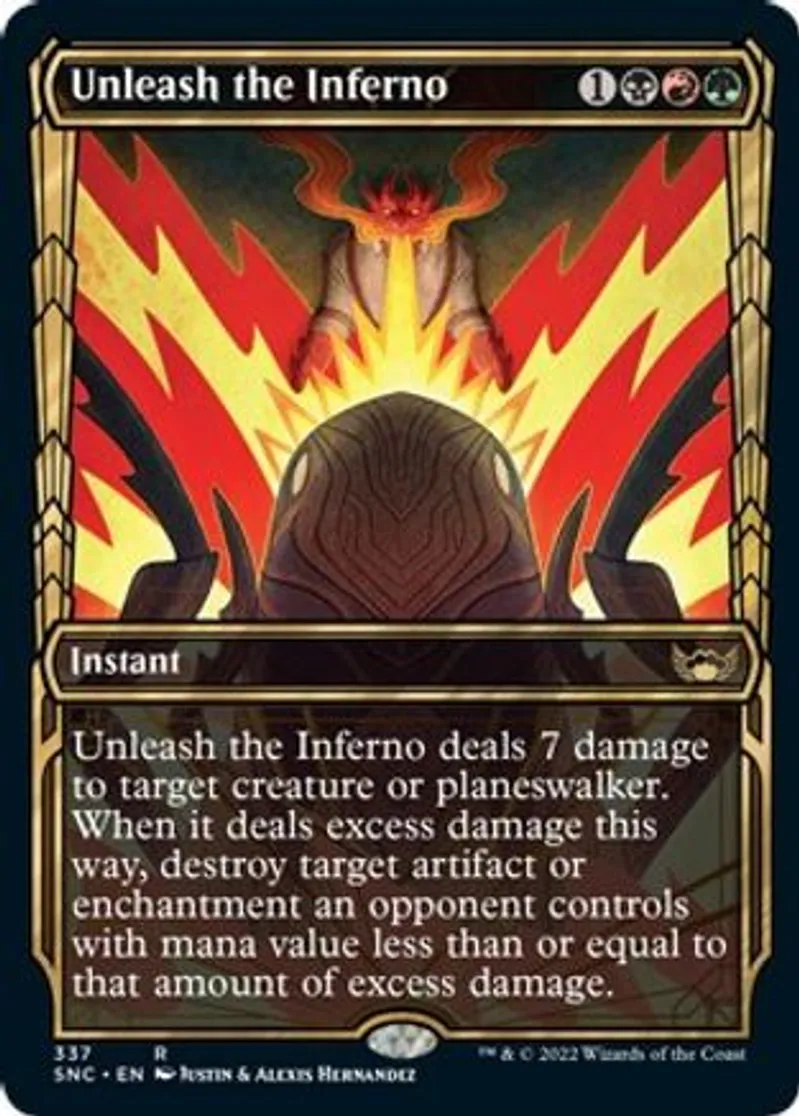 | Oracle Text | Unleash the Inferno deals 7 damage to target creature or planeswalker. When it deals excess damage this way, destroy target artifact or enchantment an opponent controls with mana value less than or equal to that amount of excess damage. | ||