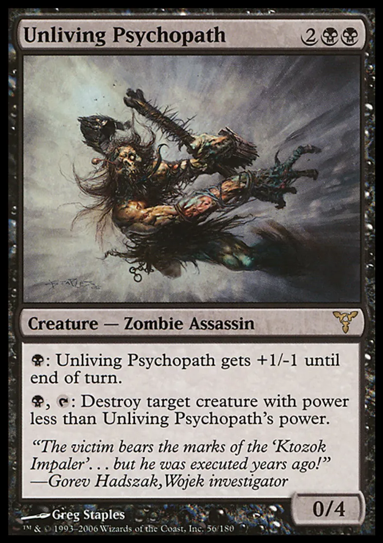 | Oracle Text | {{b}}: Unliving Psychopath gets +1/-1 until end of turn. {{b}}, {{t}}: Destroy target creature with power less than Unliving Psychopath's power. | ||