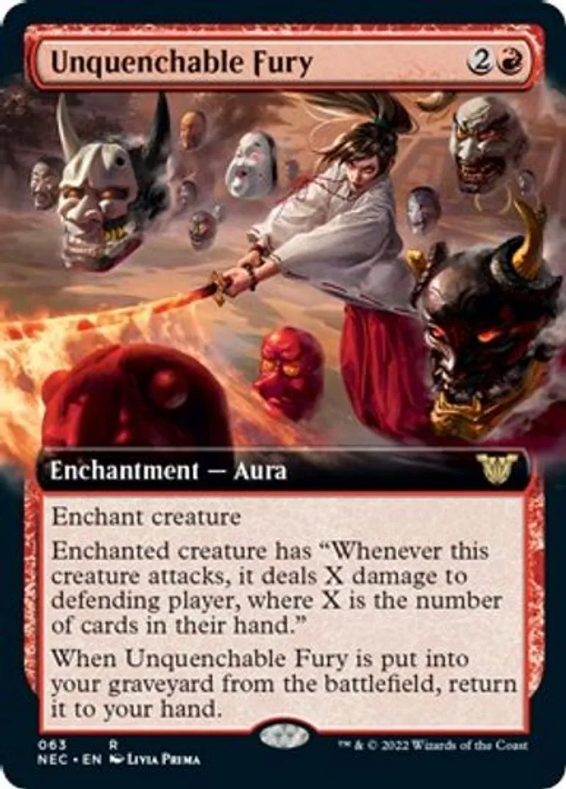 Unquenchable Fury (Extended Art) is a Rare in the set Commander: Kamigawa: Neon Dynasty.