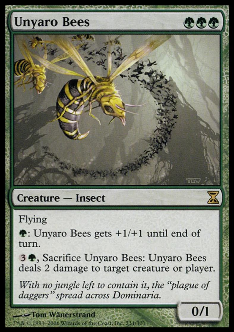 | Oracle Text | Flying {{g}}: Unyaro Bees gets +1/+1 until end of turn. {{3}}{{g}}, Sacrifice Unyaro Bees: Unyaro Bees deals 2 damage to target creature or player. | ||