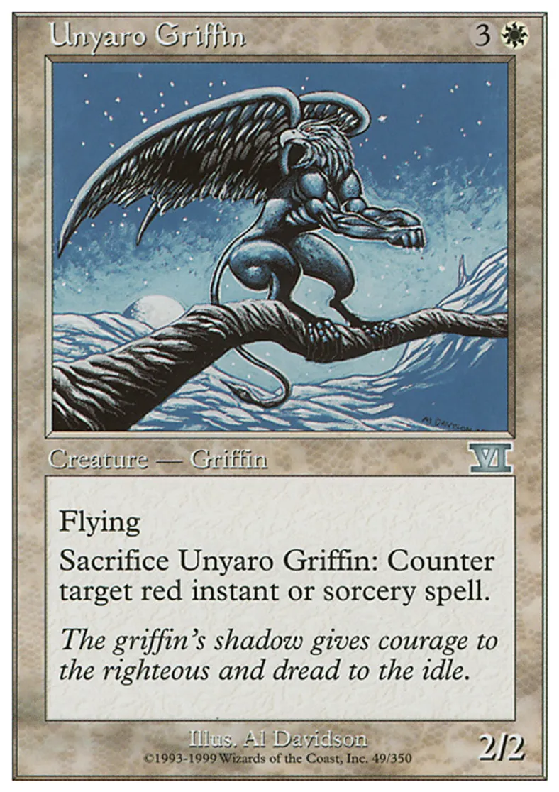 | Oracle Text | Flying Sacrifice Unyaro Griffin: Counter target red instant or sorcery spell. | ||