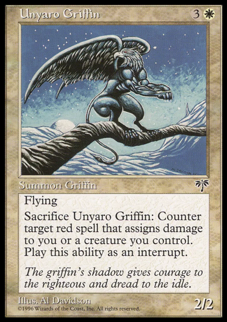 | Oracle Text | Flying Sacrifice Unyaro Griffin: Counter target red instant or sorcery spell. | ||