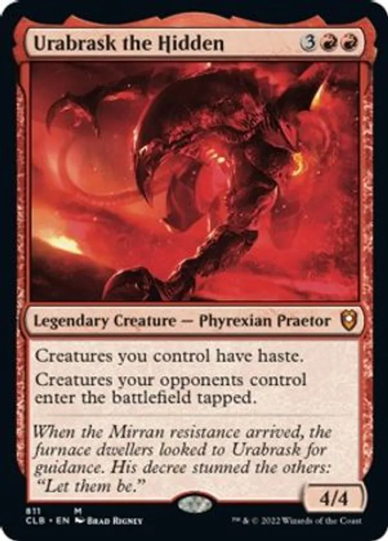 Urabrask the Hidden is a Mythic Rare in the set Commander Legends: Battle for Baldur's Gate.