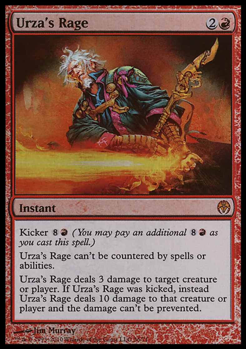 | Oracle Text | Kicker {{8}}{{r}} (You may pay an additional {{8}}{{r}} as you cast this spell.) Urza's Rage can't be countered by spells or abilities. Urza's Rage deals 3 damage to target creature or player. If Urza's Rage was kicked, instead it deals 10 damage to that creature or player and the damage can't be prevented. | ||