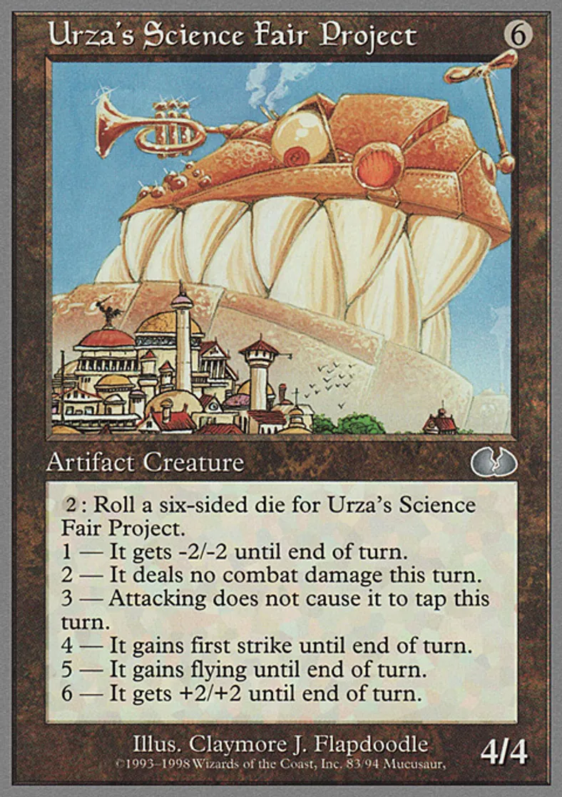 | Oracle Text | o2: Roll a six-sided die for Urza's Science Fair Project. 1 It gets -2/-2 until end of turn. 2 It deals no combat damage this turn. 3 Attacking does not cause it to tap this turn. 4 It gains first strike until end of turn. 5 It gains flying until end of turn. 6 It gets +2/+2 until end of turn. | ||