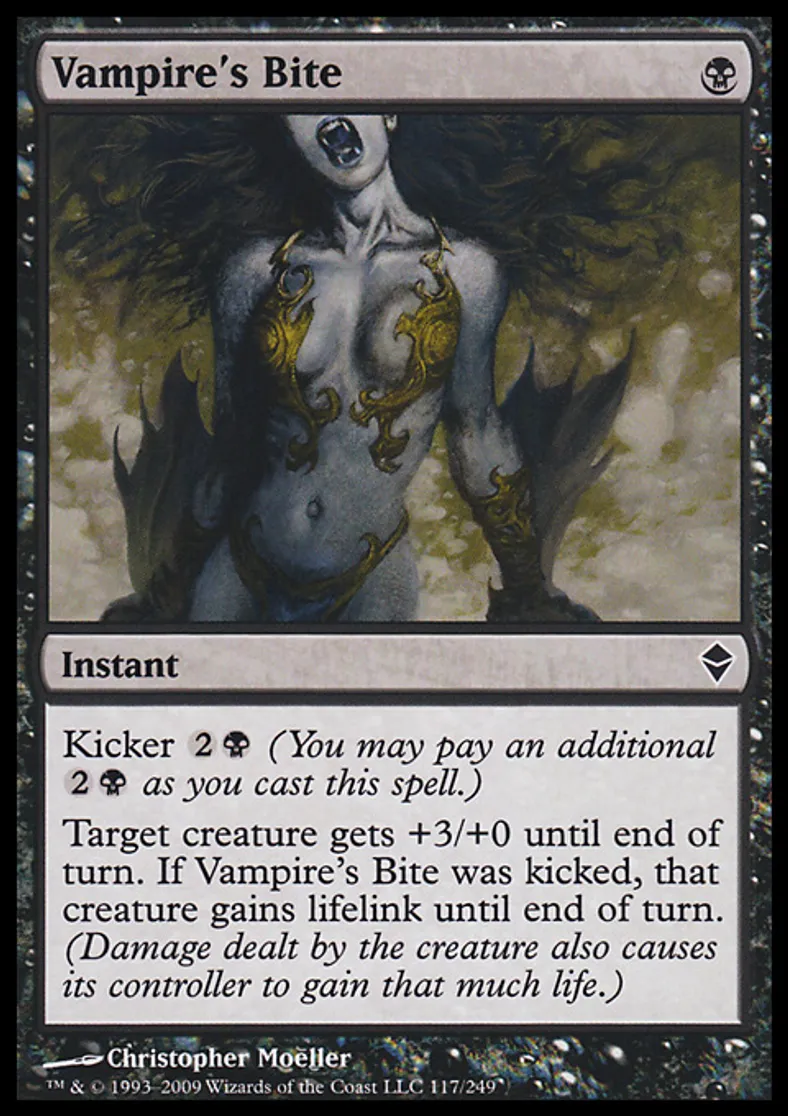 | Oracle Text | Kicker {{2}}{{b}} (You may pay an additional {{2}}{{b}} as you cast this spell.) Target creature gets +3/+0 until end of turn. If Vampire's Bite was kicked, that creature gains lifelink until end of turn. (Damage dealt by the creature also causes its controller to gain that much life.) | ||